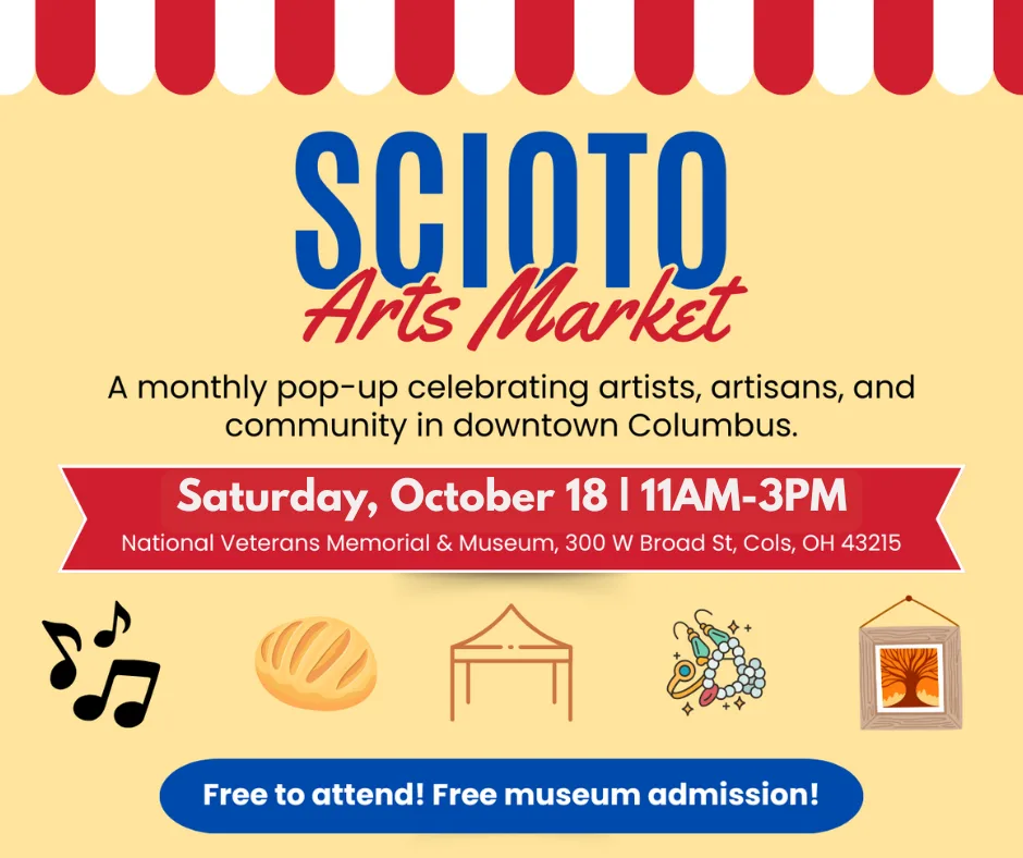 Looking for a fun Saturday outing? Head to the Scioto Arts Market on Saturday, October 18th from 11am-3pm at the National Veterans Memorial & Museum (300 W Broad St, Columbus, OH 43215) for a morning of creativity and community! Shop dozens of local artists and makers, live music, food trucks, face-painting, a bounce house for kids, free museum admission, and on-site parking. Free to attend—no registration required!